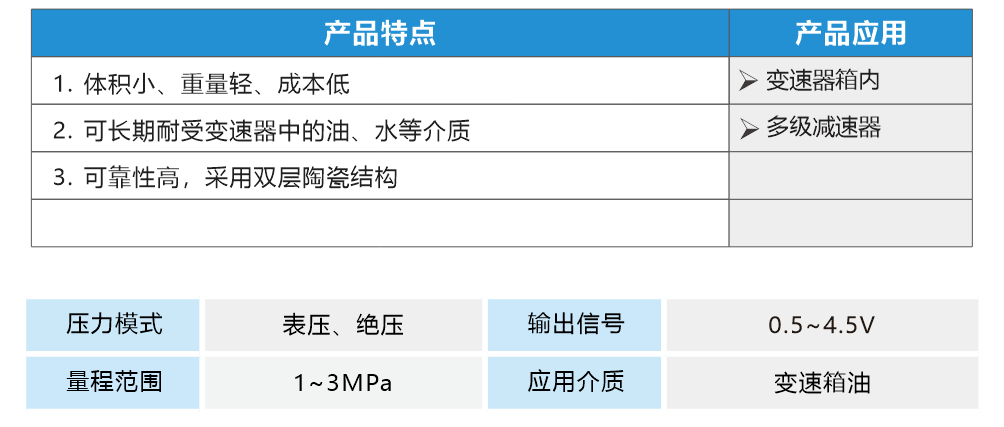 胜脉电子的变速器压力传感器是为变速器、多级减速器设计的油压传感器,内部采用双层陶瓷板压力敏感器件,能够耐受机油、变速箱油腐蚀,具有良好的材料稳定性和密封可靠性。输入5/ 12/24V电压,输出0. 5 ~4. 5V电压信号。