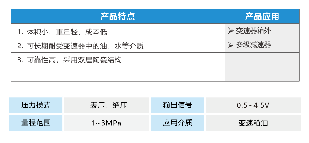 胜脉电子的变速器压力传感器是为变速器、多级减速器设计的油压传感器,内部采用双层陶瓷板压力敏感器件,能够耐受机油、变速箱油腐蚀,具有良好的材料稳定性和密封可靠性。输入5/ 12/24V电压,输出0. 5 ~4. 5V电压信号。