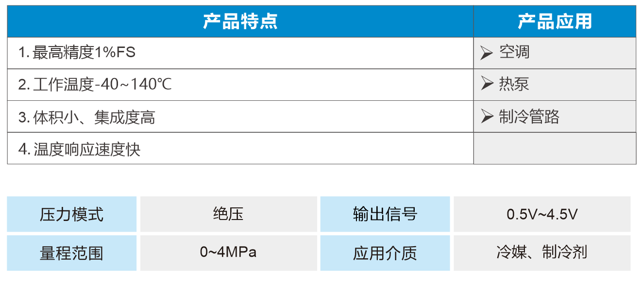 空调中的制冷剂(冷媒)具有很高的工作频率,而有些制冷剂是易燃易爆的。因此,通常在空调压缩机和冷凝器之间的高压管道上安装一个压力传感器。根据制冷剂压力的大小检测制冷剂的用量和压缩机的运行情况,并与温度传感器配合,控制空调系统的运行和关闭。
