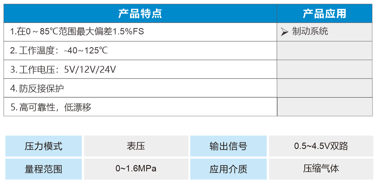 胜脉电子的PGDM系列用于汽车气制动系统。具有高可靠性、高精度等特点。输入电压为5/12/24V,输出0.5~4.5V双路电压信号。