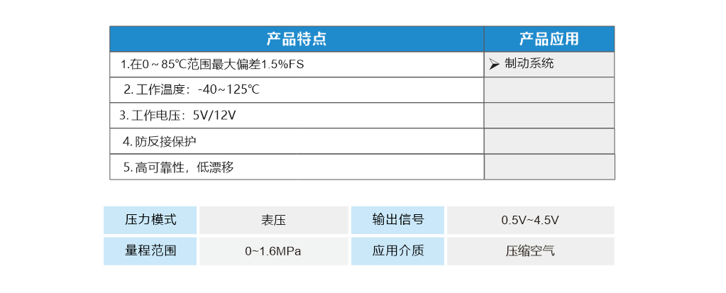胜脉电子的EBS压力传感器用于商用车集成式EBS系统,自身体积小,占用空间小。具有高可靠性、高精度等特点。输入电压为5/12V,输出0.5~4.5V电压信号。